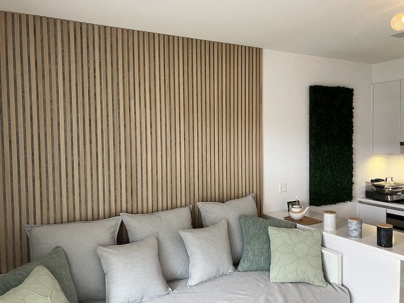 Pour répondre à ses besoins, nous lui avons proposé d'habiller une partie d'un mur de la pièce avec des panneaux de tasseaux de bois et des panneaux à base de mousse naturelle de la marque WoodUpp.