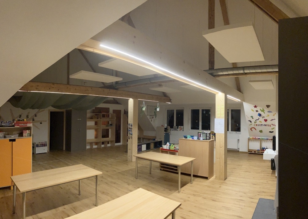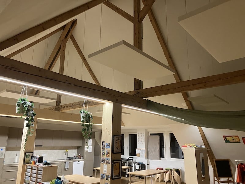 Nous avons été sollicités par l'architecte responsable de l'aménagement de l’UAPE de Salvan pour une mission d’amélioration acoustique. Dans cette grande salle sous les combles, le besoin était de réduire les résonances sonores qui impactaient le confort des usagers. Retour sur ce projet.