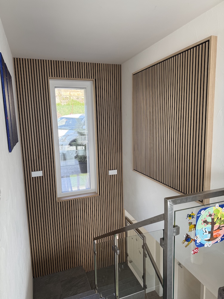 Séduits par notre approche et nos conseils, les clients ont opté pour un traitement du mur de l’escalier avec des panneaux à lamelles de bois ajourées WoodUpp, complété par un tableau acoustique assorti dans la même esthétique.