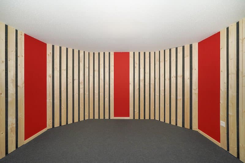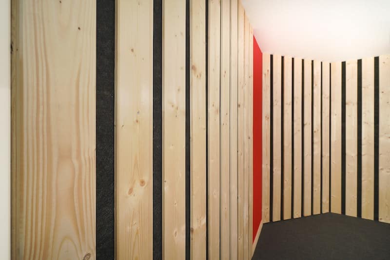 Pour limiter les coûts, nous avons alterné des sections de planches ajourées avec des parties en feutre rouge. Ce matériau, en plus d'être économique, offre également d’excellentes propriétés acoustiques.
